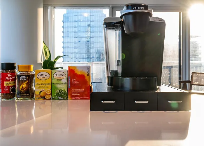 تحتوي الشقة على منطقة المطبخ الصغير المجهز المزود بالمايكرويف والغلاية الكهربائية والمجمدة، بالإضافة إلى أدوات تحضير القهوة والشاي. يقع مكان الإقامة على بعد مسافة سير من أقرب محطة للحافلات - Union Station GO Terminal. يحتوي مكان الإقامة على الساونا وحمام السباحة الداخلي للاسترخاء والانتعاش.